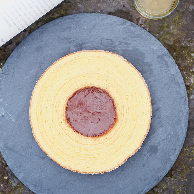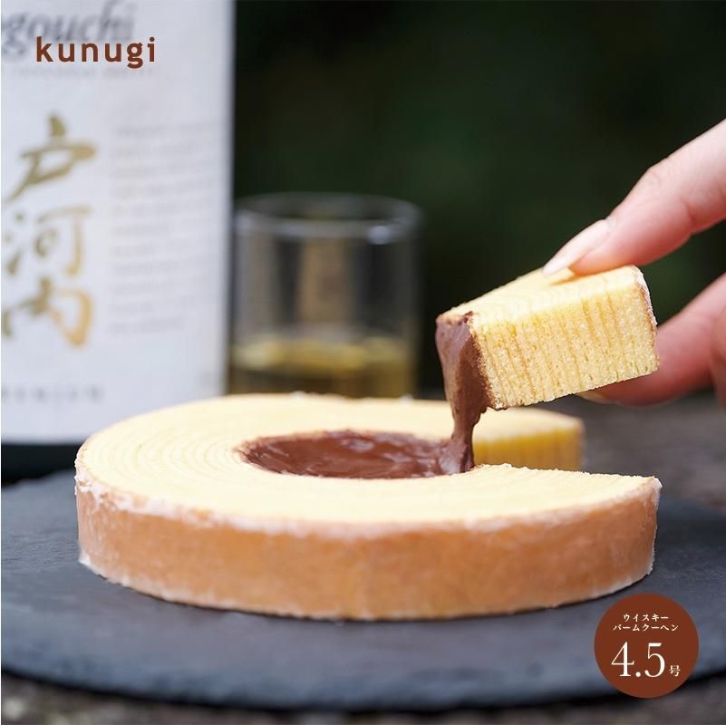 ふんわりしっとりバームクーヘンの中央に、芳醇な香りのウイスキーを混ぜた濃厚チョコレートをたっぷりと流し込みました。