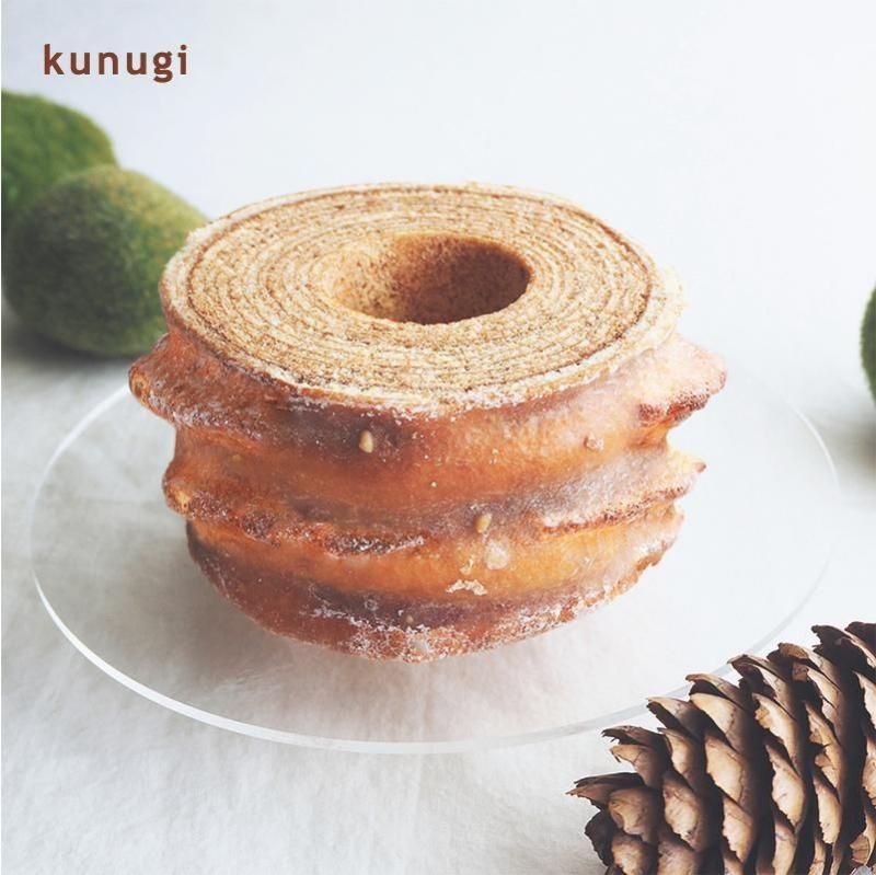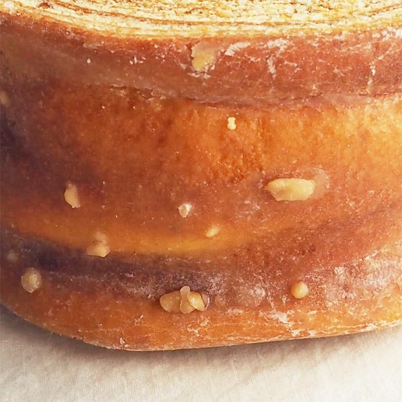 砕いた松の実をグラスに混ぜ込んだバームクーヘン 松の実とは、松ぼっくりの中にある小さな種子を丁寧に取り出したもの。 アーモンドパウダーと松の実の香ばしいナッツの風味に、広島県産の卵の濃厚でリッチな味わいのもっちり食感が特徴です。